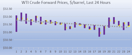 WTI (West Texas Intermediate) crude prices opened on today’s NYMEX session at $51.54/b today, a recovery of $0.92 (1.82%) from yesterday’s opening price of $50.62/b. Over the last 24-hour period from 9AM EST to 9AM EST, crude futures recovered by $0.23/b (0.45%.) Currently, crude prices are stable, but not making any sizeable gains. The latest price is $51.68/b.