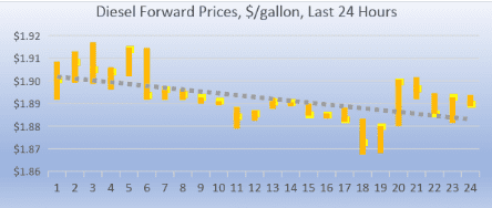 Diesel opened on the NYMEX at $1.8909/gallon today, a modest recovery of 1.33 cents (0.69%) from yesterday’s opening price of $1.8776/gallon. Over the last 24-hour period from 9AM EST to 9AM EST, diesel prices declined slightly by 0.35 cents/gallon (0.18%.) Currently, diesel prices appear to be stabilizing. The latest price is $1.8943/gallon.
