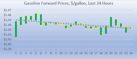Gasoline opened on the NYMEX at $1.4406/gallon today, recouping 4.89 cents (3.34%) of yesterday’s massive loss of 11.02 cents/gallon. Over the last 24-hour trading period from 9AM EST to 9AM EST, gasoline prices recovered by 1.37 cents/gallon (0.96%.) Currently, gasoline prices are languishing, giving back the recent recovery. The latest price is $1.4344/gallon.