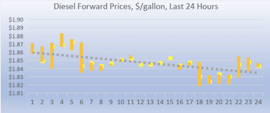 Diesel opened on the NYMEX at $1.8438/gallon today, a significant drop of 5.8 cents (3.04%) from yesterday’s opening price of $1.9018/gallon. Over the last 24-hour period from 9AM EST to 9AM EST, diesel prices declined by 1.73 cents/gallon (0.93%.) Currently, diesel prices appear to have hit bottom, and prices now are stabilizing. The latest price is $1.8414/gallon.