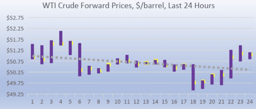 WTI (West Texas Intermediate) crude prices opened on today’s NYMEX session at $50.31/b today, a drop of $1.78 (3.42%) from yesterday’s opening price of $52.09/b. This session included the lowest traded price of the year to date–$49.41/b. The dip below the $50/b mark was brief, however. Over the last 24-hour period from 9AM EST to 9AM EST, crude futures declined slightly by $0.12/b (0.23%.) Currently, crude prices are trending back up. The latest price is $51.06/b.