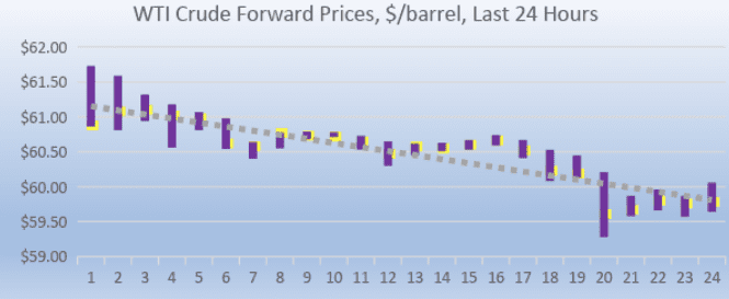 WTI (West Texas Intermediate) crude prices opened on today’s NYMEX session at $60.75, down by $0.89 (1.44%) from yesterday’s opening price of $61.64/b. Over the last 24-hour period from 9AM EST to 9AM EST, crude futures prices plummeted by $1.97/b (3.19%.) Currently, crude prices are continuing to weaken, and they have collapsed below $60/b. The latest price is $59.54/b.