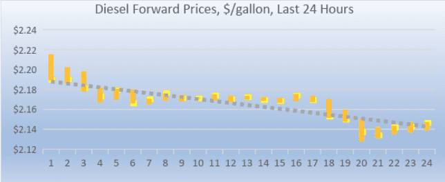 Diesel opened on the NYMEX at $2.1724/gallon today, a sharp drop of 6.47 cents (2.87%) that more than reversed yesterday’s gain of 5.47 cents (2.44%). Over the last 24-hour period from 9AM EST to 9AM EST, diesel prices dropped by 7.31 cents/gallon (3.3%.) Currently, the downward trend in diesel prices appears to be slowing, with prices so far holding at around $2.13/gallon. The latest price is $2.1354/gallon.