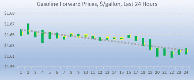 Gasoline opened on the NYMEX at $1.6483/gallon today, a tiny increase of 0.01 cents (0.06%) above yesterday’s opening price of $1.6473/gallon. Over the last 24-hour trading period from 9AM EST to 9AM EST, gasoline prices dropped by 3.95 cents/gallon (2.38%.) Currently, gasoline prices are continuing to trend down. The latest price is $1.6171/gallon.