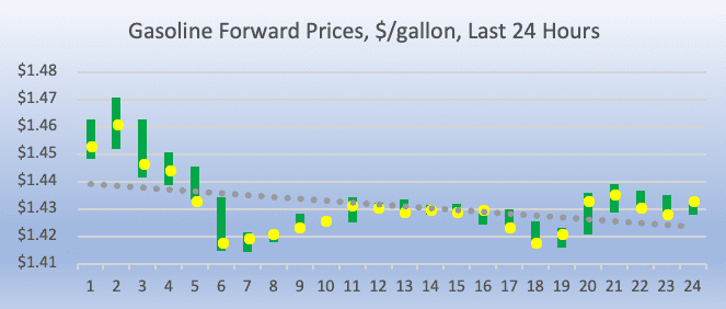 Gasoline opened on the NYMEX at $1.4232/gallon today, down by 4.08 cents (2.74%) from yesterday’s opening price of $1.464 cents/gallon. Over the last 24-hour trading period from 9AM EST to 9AM EST, gasoline prices fell by 3.12 cents/gallon (2.14%.) Currently, gasoline prices have recovered to the range of $1.43-$1.45/gallon. The latest price is $1.4386/gallon.