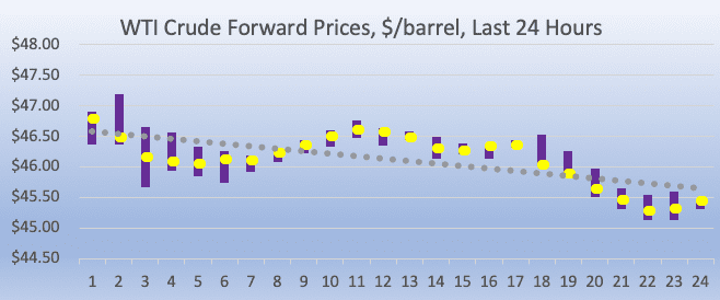 WTI (West Texas Intermediate) crude forward prices opened at $46.25/b today, a drop of $1.14 (2.41%) from yesterday’s opening price of $47.39/b. This is the fourth consecutive day that WTI prices have opened below $50/b. Over the last 24-hour period from 9AM EST to 9AM EST, crude futures fell by $1.25/b (2.68%.) Over the past four days, WTI crude oil prices have hit multi-year lows, with prices falling as low as $45.13/b today. Until just the past two weeks, WTI lows have not dipped below $50/b, much less below $46/b. Prices continue to weaken this morning, already down by $0.50-$0.75 from the opening price. Today’s lows are threatening to fall below the $45/b mark, but current prices are holding above $45.50/b. The latest price is $45.68/b.