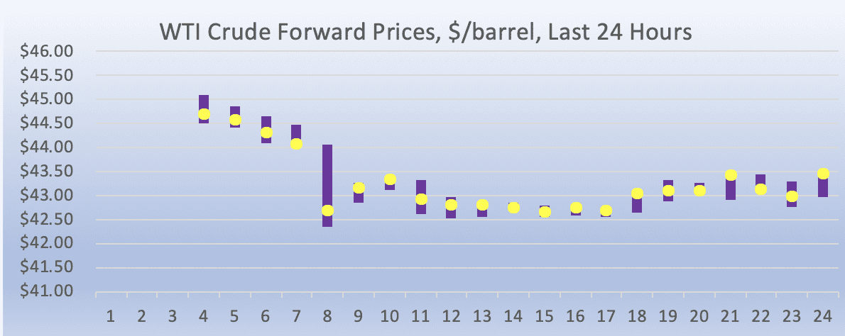 WTI (West Texas Intermediate) crude forward prices opened at $42.85/b today, a drop of $2.60 (5.72%) from Monday’s opening price of $45.45/b. This was the sixth consecutive session that WTI prices have opened below $50/b. It was the lowest opening price since February 2016. Since Monday at 9AM EST, crude futures prices have fallen by $1.82/b (4.06%.) Until just the past two weeks, WTI lows have not dipped below $50/b, much less below $43/b. Prices currently are rising. The latest price is $44.12/b.