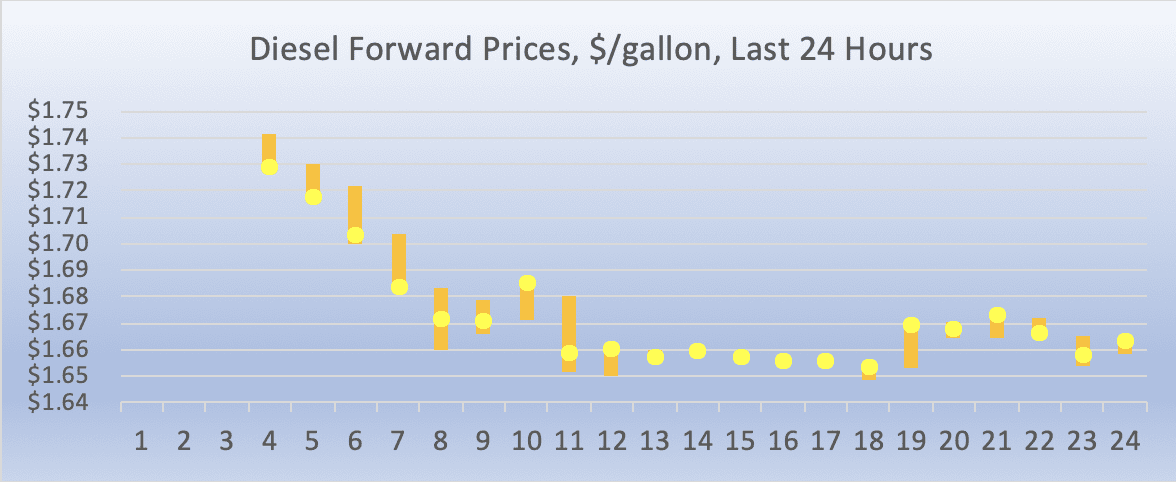 Diesel opened on the NYMEX at $1.671/gallon today, a drop of 6.33 cents (3.61%) from Monday’s opening price of $1.7343/gallon. Since Monday at 9AM EST, diesel prices fell sharply by 7.78 cents/gallon (4.48%.) Diesel prices currently are recovering. The latest price is $1.69/gallon.