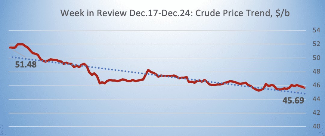 During the week ended December 21st, WTI crude forward prices collapsed by $5.66/b (11.0%.) WTI prices started the week at $51.25/b, and they ended on Friday at $45.59/b. Diesel forward prices opened on Monday at $1.8452/gallon and closed on Friday at $1.7327/gallon, a loss of 11.25 cents/gallon (6.1%.) Gasoline forward prices opened on Monday at $1.4362/gallon, and they fell by 11.79 cents (8.2%) to end on Friday at $1.3183/gallon.