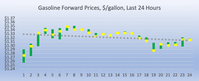 Gasoline opened on the NYMEX at $1.3419/gallon today, a jump of 8.19 cents (6.06%) from yesterday’s opening price of $1.26 cents/gallon. Over the past 24 hours from 9AM EST to 9AM EST, gasoline prices rose by 5.97 cents (4.75%.) Gasoline prices are trading up and down currently, working to hold the gains, but the overall trend is down. The latest price is $1.3217/gallon.