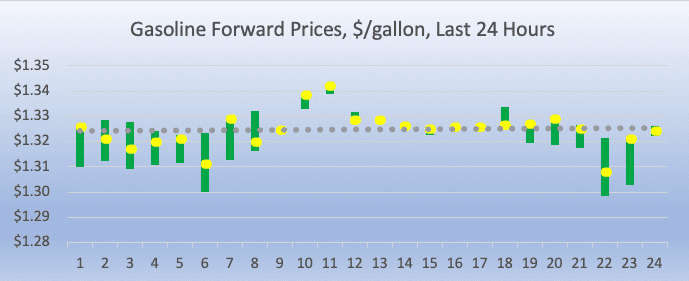 Gasoline opened on the NYMEX at $1.3243/gallon today, a decline of 1.76 cents (1.31%) from yesterday’s opening price of $1.3419 cents/gallon. Over the past 24 hours from 9AM EST to 9AM EST, gasoline prices rose by 0.56 cents (0.43%.) Gasoline prices are trending down gently at present. The latest price is $1.3174/gallon.
