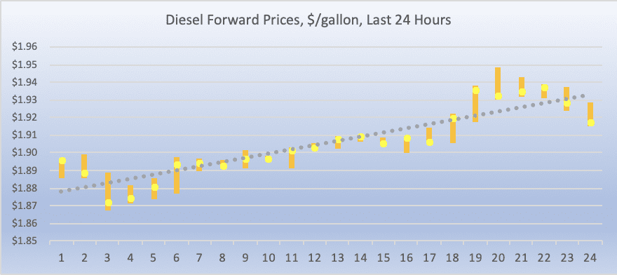 Diesel opened on the NYMEX at $1.8931/gallon today, a gain of 5.06 cents (2.65%) from yesterday’s opening price of $1.8425/gallon. Over the last 24-hour period from 9AM EST to 9AM EST, diesel prices rose by 3.31 cents/gallon (1.75%.) Currently, diesel prices have strengthened in the zone of $1.91-$1.93/gallon. The latest price is $1.9127/gallon.