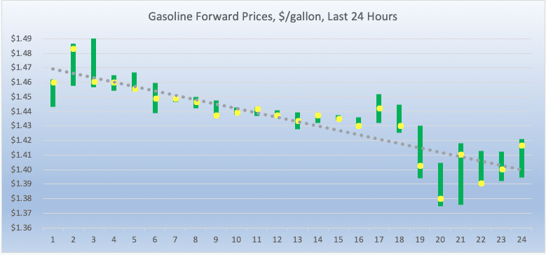 Gasoline opened on the NYMEX at $1.4426/gallon today, a recovery of 1.7 cents (1.14%) from yesterday’s opening price of $1.4256 cents/gallon. Over the last 24-hour trading period from 9AM EST to 9AM EST, gasoline prices relapsed by 4.32 cents/gallon (2.99%.) Currently, gasoline prices have retreated the range of $1.41-$1.44/gallon. The latest price is $1.4306/gallon.