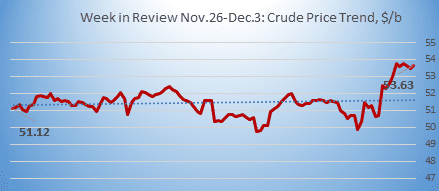 WTI (West Texas Intermediate) crude prices opened at $52.93/b today, up slightly by $0.34 (0.65%) from yesterday’s opening price of $52.59/b. Over the last 24-hour period from 9AM EST to 9AM EST, crude futures dropped again by $1.28/b (2.44%.) As noted above, however, the Jobs Report and the news of an OPEC-NOPEC production cut agreement has just caused a price surge. Oil prices have hit peak highs of $54/b, and they currently are in the range of $53.50/b-$54.00/b. The latest price is $53.63/b.