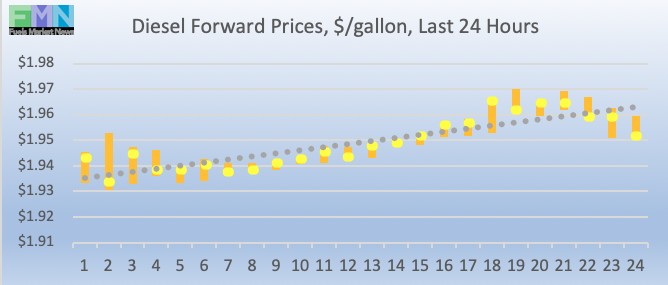Diesel opened on the NYMEX at $1.9393/gallon today, up by 2.51 cents (1.29%) from yesterday’s opening price of $1.9142/gallon. Over the past 24 hours from 9AM EST to 9AM EST, diesel prices rose by 2.43 cents (1.26%,) hitting highs of $1.97/gallon. Diesel prices currently are retreating, trading back in the range of $1.93-$1.96/gallon. The latest price is $1.9445/gallon.