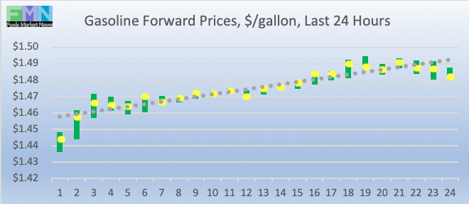 Gasoline opened on the NYMEX at $1.4687/gallon today, up by 3.56 cents (2.42%) from yesterday’s opening price of $1.4331 cents/gallon. Over the past 24 hours from 9AM EST to 9AM EST, gasoline prices jumped by 4.6 cents (3.19%.) Prices surged yesterday, nearly reaching $1.50/gallon (a level not seen since November,) but they are currently trending back down to a range of $1.45-$1.48/gallon. The latest price is $1.4743/gallon.