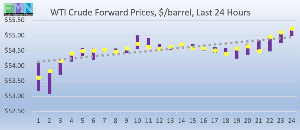 WTI (West Texas Intermediate) crude forward prices opened at $54.48/b today, up by $0.52 (0.96%) from yesterday’s opening price of $53.96/b. Prices have hit highs of over $55/b. Over the past 24 hours from 9AM EST to 9AM EST, WTI crude prices rose by $1.02 (1.89%.) Currently, prices are still trending up, trading in the range of $54.50/b-$55.50. The latest price is $55.24/b.