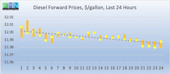 Diesel opened on the NYMEX at $1.9984/gallon today, down by 2.3 cents (1.13%) from yesterday’s opening price of $2.0214/gallon. Until yesterday, diesel forward prices had not opened above the $2/gallon level since November 20th. Over the past 24 hours from 9AM EST to 9AM EST, diesel prices fell by 2.3 cents (1.15%.) Diesel prices currently are easing, yielding the territory above $2.00/gallon. The latest price is $1.988/gallon.