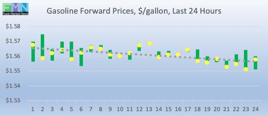 Gasoline opened on the NYMEX at $1.5643/gallon today, down by 0.85 cents (0.54%) from yesterday’s opening price of $1.5728 cents/gallon. Yesterday’s opening price was the highest since November 20th. Over the past 24 hours from 9AM EST to 9AM EST, gasoline prices fell by 1.62 cents (1.03%.) Gasoline forward prices are currently trending down, trading in a range of $1.55-$1.57/gallon. The latest price is $1.5599/gallon.