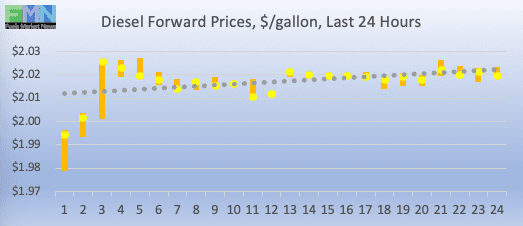 Diesel opened on the NYMEX at $2.0189/gallon today, up by 2.05 cents (1.01%) from yesterday’s opening price of $1.9984/gallon. Until this week, diesel forward prices had not opened above the $2/gallon level since November 20th. Over the past 24 hours from 9AM EST to 9AM EST, diesel prices rose by 4.02 cents (2.03%.) Diesel prices currently are stable, hovering in the range of $2.00-$2.03/gallon. The latest price is $2.0252/gallon.