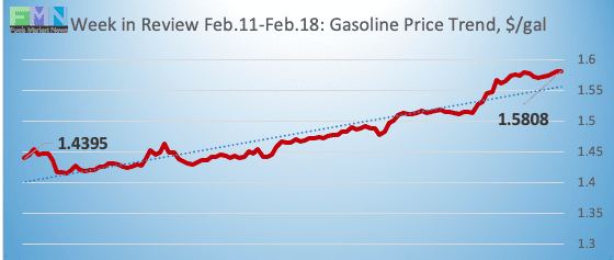 Gasoline opened on the NYMEX at $1.60/gallon today, up by 3.57 cents (2.23%) from yesterday’s opening price of $1.5643 cents/gallon. Today’s opening price was the highest since November 13th. Over the past 24 hours from 9AM EST to 9AM EST, gasoline prices rose significantly by 4.6 cents (2.96%.) Gasoline forward prices are currently hovering in a range of $1.59-$1.61/gallon. The latest price is $1.5996/gallon.