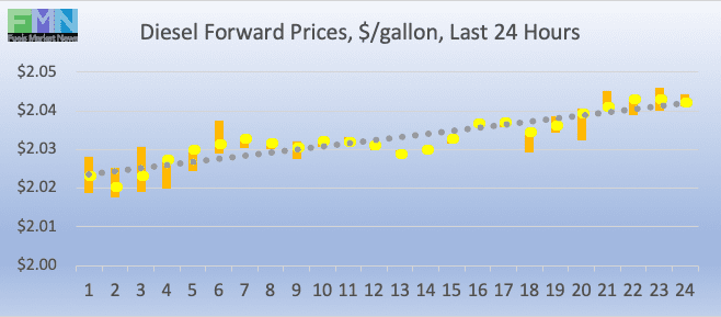 Diesel opened on the NYMEX at $2.0322/gallon today, up by 1.33 cents (0.65%) from yesterday’s opening price of $2.0189/gallon. Until this week, diesel forward prices had not opened above the $2/gallon level since November 20th. Over the past 24 hours from 9AM EST to 9AM EST, diesel prices rose by 2.37 cents (1.19%.) Diesel prices currently are stable with an upward tilt, trading in the range of $2.03-$2.05/gallon. The latest price is $2.0375/gallon.