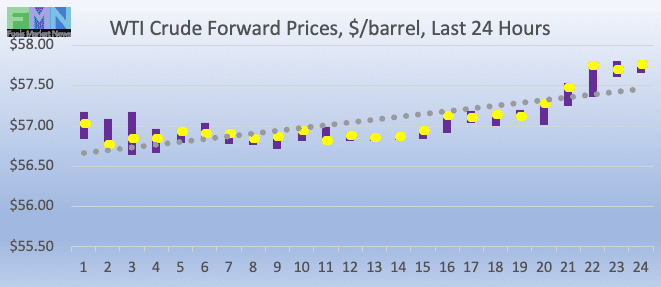 WTI (West Texas Intermediate) crude forward prices opened at $56.84/b today, down by $0.40 (0.7%) from yesterday’s opening price of $57.24/b. Prices have hit highs of over $57.80/b. Over the past 24 hours from 9AM EST to 9AM EST, WTI crude prices rose by $0.68 (1.19%.) Currently, crude prices are working to retain gains, trading in the range of $57.25/b-$57.75/b. The latest price is $57.40/b.