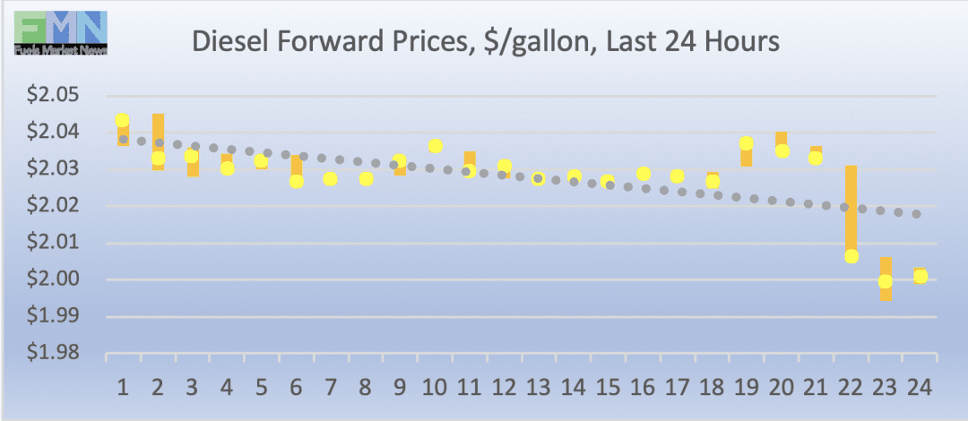 Diesel opened on the NYMEX at $2.0282/gallon today, down slightly by 0.4 cents (0.2%) from Friday’s opening price of $2.0322/gallon. Until last week, diesel forward prices had not been steadily above the $2/gallon level since mid-November. Diesel futures markets followed crude down this morning, dipping below $2/gallon, but recovering. Over the past 24 hours from 9AM EST to 9AM EST, diesel prices dropped by 4.48 cents (2.19%.) Diesel prices currently have reclaimed the $2/gallon level, trading in the range of $2.00-$2.01/gallon. The latest price is $2.0065/gallon.