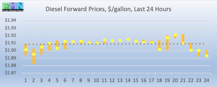 Diesel opened on the NYMEX at $1.9122/gallon today, down by 0.53 cents (0.27%) from yesterday’s opening price of $1.9175/gallon. Over the past 24 hours from 9AM EST to 9AM EST, diesel prices declined by 0.75 cents (0.39%.) Diesel prices currently are stabilizing. The latest price is $1.9007/gallon.