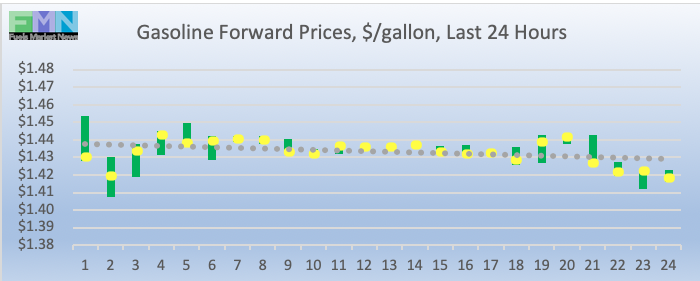 Gasoline opened on the NYMEX at $1.4395/gallon today, up by 0.44 cents (0.3%) from yesterday’s opening price of $1.4351cents/gallon. Over the past 24 hours from 9AM EST to 9AM EST, gasoline prices dropped by 2.94 cents (2.02%.) Prices currently are declining, but perhaps are hitting a plateau. The latest price is $1.4286/gallon.