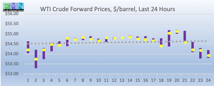 WTI (West Texas Intermediate) crude forward prices opened at $54.86/b today, down by $0.46 (0.83%) from yesterday’s opening price of $55.32/b. Over the past 24 hours from 9AM EST to 9AM EST, WTI crude prices declined by $0.37 (0.68%.) Prices are waning this morning, and have been having difficulty remaining above $54/b, but the downward movement appears to have hit a plateau. The latest price is $54.09/b.