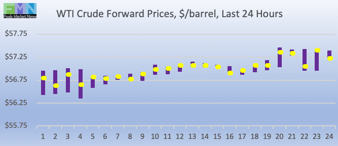 WTI (West Texas Intermediate) crude forward prices opened at $56.76/b today, up by $0.69 (1.23%) from yesterday’s opening price of $56.07/b. Over the past 24 hours from 9AM EST to 9AM EST, WTI crude prices rose by $0.93 (1.65%.) Currently, crude prices are working to stay in the territory above $57/b, trading in the range of $57.00-$57.25/b. The latest price is $57.17/b.