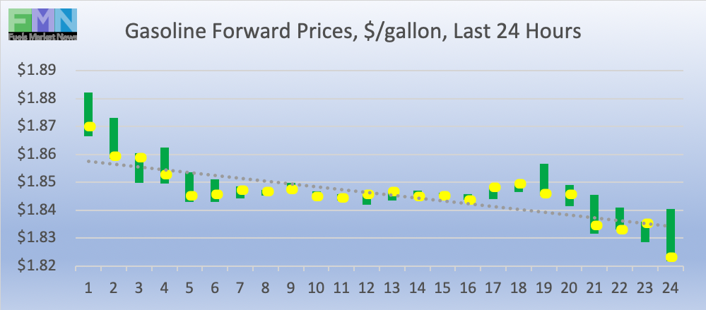 Gasoline opened on the NYMEX at $1.848/gallon today, down by 2.5 cents (1.33%) from yesterday’s opening price of $1.873 cents/gallon. Over the past 24 hours from 9AM EST to 9AM EST, gasoline prices dropped significantly by 4.21 cents (2.24%,) handing back essentially all of yesterday’s gains. Gasoline forward prices currently are trending down, trading between $1.82-$1.84/gallon. The latest price is $1.8327/gallon.