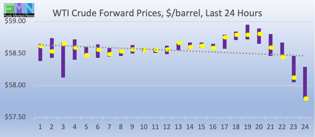 WTI (West Texas Intermediate) crude forward prices opened at $58.51/b today, up slightly by $0.16 (0.27%) from yesterday’s opening price of $58.35/b. Over the past 24 hours from 9AM EST to 9AM EST, WTI crude prices declined by $0.39 (0.67%.) Currently, crude prices are falling, giving up the $58.50/b level and now trading in the range of $57.75-$58.25/b. The latest price is $58.06/b.