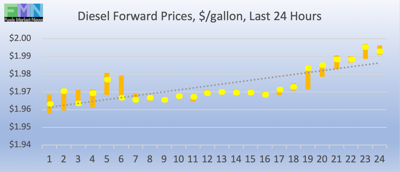 Diesel opened on the NYMEX at $1.9666/gallon today, up fractionally by 0.03 cents (0.02%) from yesterday’s opening price of $1.9663/gallon. Over the past 24 hours from 9AM EST to 9AM EST, diesel prices rose slightly by 0.26 cents (0.13%.) Diesel prices are trending back up, after finishing last week in the red. Currently, forward prices are in the $1.98-$1.99/gallon range, and prices may recover the $2/gallon level. The latest price is $1.9915/gallon.