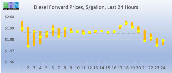 Diesel opened on the NYMEX at $1.99/gallon today, up by 2.34 cents (1.17%) from yesterday’s opening price of $1.9666/gallon. Over the past 24 hours from 9AM EST to 9AM EST, diesel prices handed back most of yesterday’s gains, falling by 2.04 cents (1.02%.) Diesel prices stabilizing currently, trading in the $1.97-$1.99/gallon range. The latest price is $1.9869/gallon.