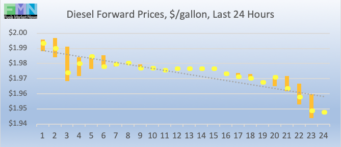Diesel opened on the NYMEX at $1.9795/gallon today, down by 1.14 cents (0.57%) from yesterday’s opening price of $1.9909/gallon. Over the past 24 hours from 9AM EST to 9AM EST, diesel prices dropped by 4.16 cents (2.09%.) Diesel prices are trending down currently, trading in the $1.94-$1.96/gallon range. The latest price is $1.9472/gallon.