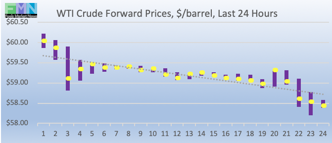 WTI (West Texas Intermediate) crude forward prices opened at $59.40/b today, down by $0.63 (1.05%) from yesterday’s opening price of $60.03/b. Yesterday was the first time since November 12th that WTI forward prices had opened above $60/b. Over the past 24 hours from 9AM EST to 9AM EST, WTI crude prices retreated by $1.41 (2.35%.) Currently, crude prices are declining, dipping below $58.50/b. The latest price is $58.71/b.