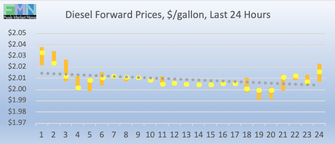 Diesel opened on the NYMEX at $2.011/gallon today, up by 1.11 cents (0.54%) from yesterday’s opening price of $1.99/gallon. Over the past 24 hours from 9AM EST to 9AM EST, diesel prices fell by 1.57 cents (0.78%.) Diesel prices remain in the territory above $2/gallon, and prices are in the range of $2.00-$2.02/gallon. The latest price is $2.0142/gallon.