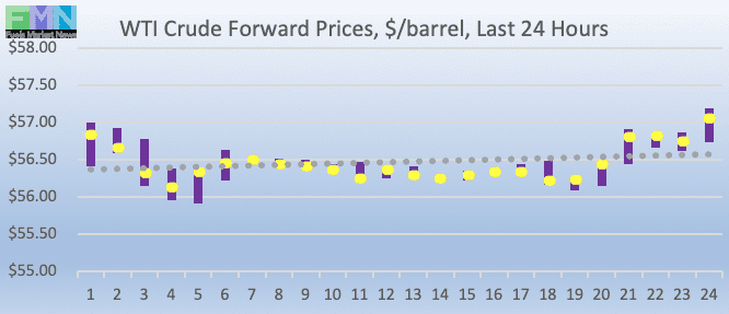 WTI (West Texas Intermediate) crude forward prices opened at $56.45/b today, up by $0.62 (1.11%) from yesterday’s opening price of $55.83/b. Over the past 24 hours from 9AM EST to 9AM EST, WTI crude prices rose modestly by $0.30 (0.53%.) Currently, crude prices are trending up, holding above the $56.50/b level and looking to $57/b. The latest price is $57.04/b.
