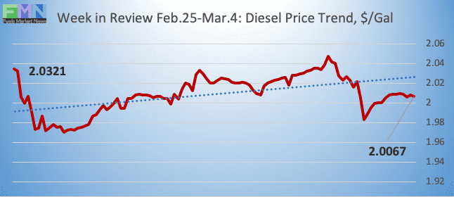 Diesel opened on the NYMEX at $2.0124/gallon today, down by 0.22 cents (0.11%) from yesterday’s opening price of $2.0146/gallon. Prices quickly yielded the territory above $2/gallon. Over the past 24 hours from 9AM EST to 9AM EST, diesel prices dropped significantly by 6.45 cents (3.18%.) Diesel prices currently are trending down, trading in the range of $1.94-$1.97/gallon. The latest price is $1.9559/gallon.