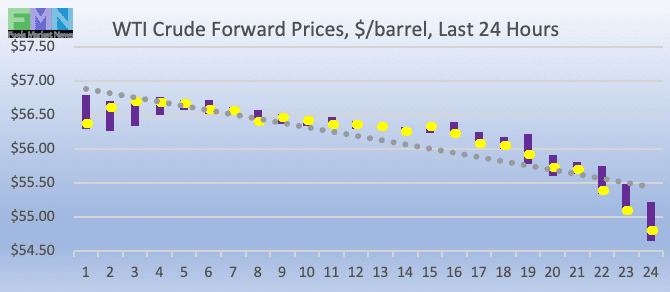 WTI (West Texas Intermediate) crude forward prices opened at $56.43/b today, up by $0.23 (0.41%) from yesterday’s opening price of $56.20/b. Over the past 24 hours from 9AM EST to 9AM EST, WTI crude prices dropped by $1.63 (2.87%.) Currently, crude prices are falling, and they have dropped below the $55/b level for the first time in around three weeks. The latest price is $54.95/b.