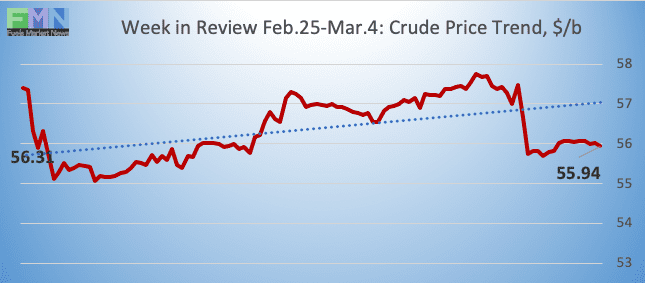 Oil prices fell yesterday after statements from the president of the European Central Bank (ECB.) ECB President Mario Draghi warned that economic weakness would continue, saying the global economy was in “a period of continued weakness and pervasive uncertainty.” The ECB downgraded its forecast of 2019 GDP growth. Asian stock markets fell in response, and also upon data showing that Chinese exports were lower than expected in February.