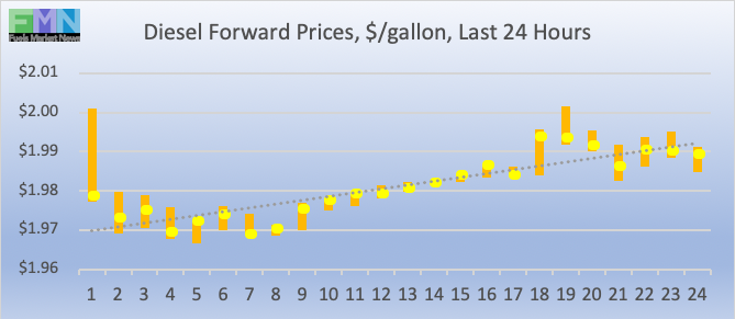 Diesel opened on the NYMEX at $1.970/gallon today, down by 0.47 cents (0.23%) from Friday’s opening price of $1.9747/gallon. Over the past 24 hours from 9AM EST to 9AM EST, diesel prices declined by 0.34 cents (0.17%.) Diesel prices are trending up currently, trading in the $1.97-$2.00/gallon range. The latest price is $1.9917/gallon.