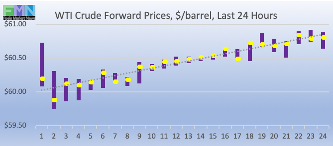 WTI (West Texas Intermediate) crude forward prices opened at $60.24/b today, up by $0.71 (1.19%) from Friday’s opening price of $59.53/b. Friday’s market was the first day since November 9th that WTI forward prices closed above $60/b. Over the past 24 hours from 9AM EST to 9AM EST, WTI crude prices rose by $0.22 (0.36%.) Currently, crude prices are remaining firmly above $60/b and are trending up. The latest price is $61.03/b.