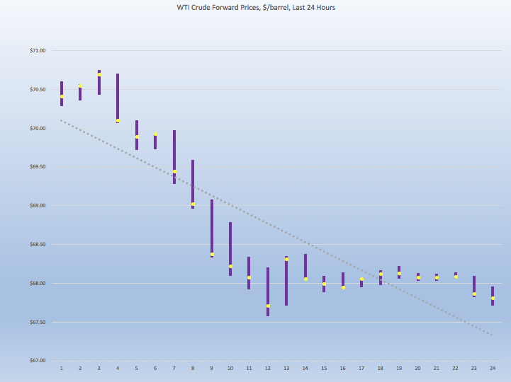 WTI (West Texas Intermediate) crude prices opened on the NYMEX at $68.03/b today. Over the last 24-hour period from 9AM EST to 9AM EST, crude prices dropped sharply by $2.73/b. The latest price is $67.38/b.