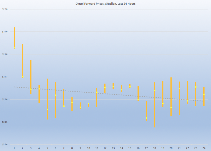 Diesel opened on the NYMEX at $2.0586/gallon today. Over the last 24-hour period from 9AM EST to 9AM EST, diesel prices dropped by 2.4 cents/gallon. The latest price is $2.055/gallon.