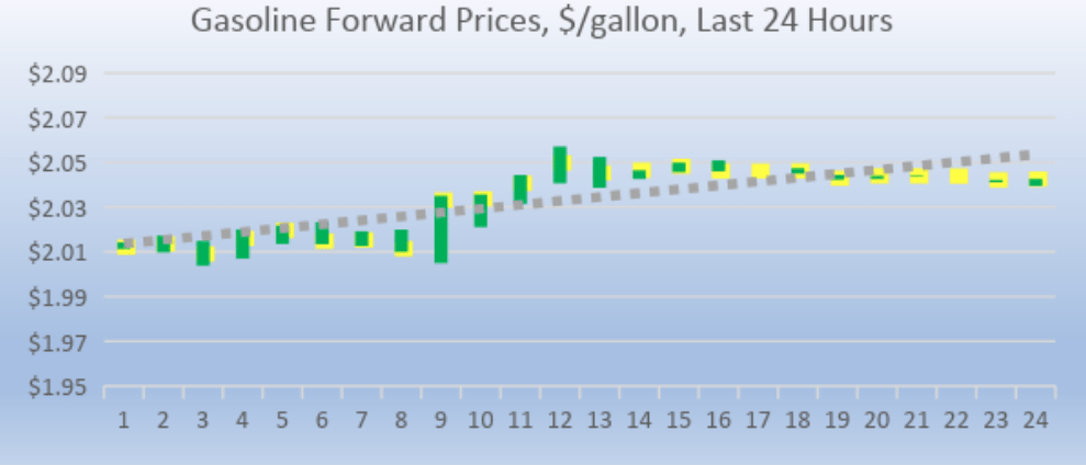 Gasoline opened on the NYMEX at $2.0497 today. Over the last 24-hour period from 9AM EST to 9AM EST, gasoline prices increased by 2.93 cents/gallon. Prices declined in early morning trading, and they are currently stable. The latest price is $2.0314/gallon.