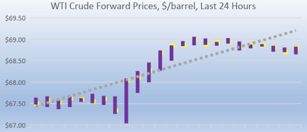 WTI (West Texas Intermediate) crude prices opened on the NYMEX at $69.00/b today. Over the last 24-hour period from 9AM EST to 9AM EST, crude prices rose by $1.18/b. Prices subsided in early morning trades, but they are currently recovering the loss. The latest price is $68.82/b.