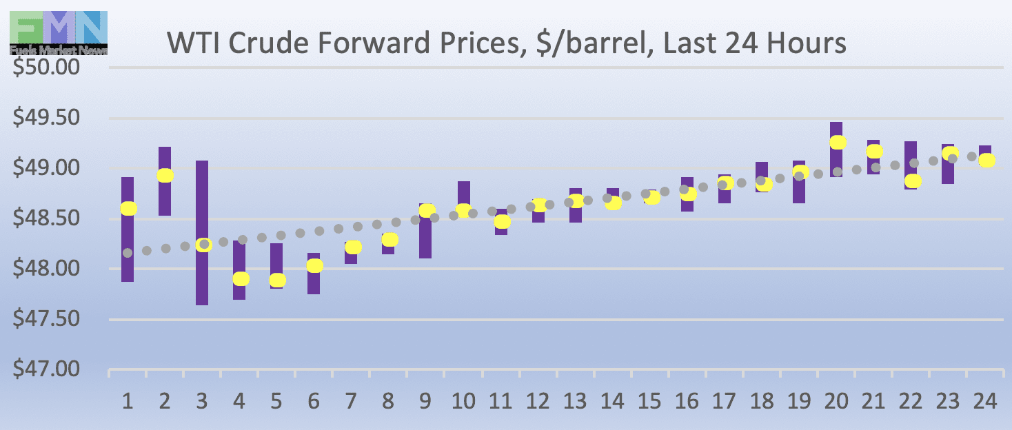 WTI (West Texas Intermediate) crude forward prices opened at $48.30/b today, an increase of $1.40 (2.99%) from Friday’s opening price of $46.26/b. Over the past 24 hours from 9AM EST to 9AM EST, WTI crude prices increased by $0.95/b (1.97%.) WTI crude prices have remained firmly above $48/b, and they have peaked above $49/b today before subsiding. The latest price is $48.56/b.